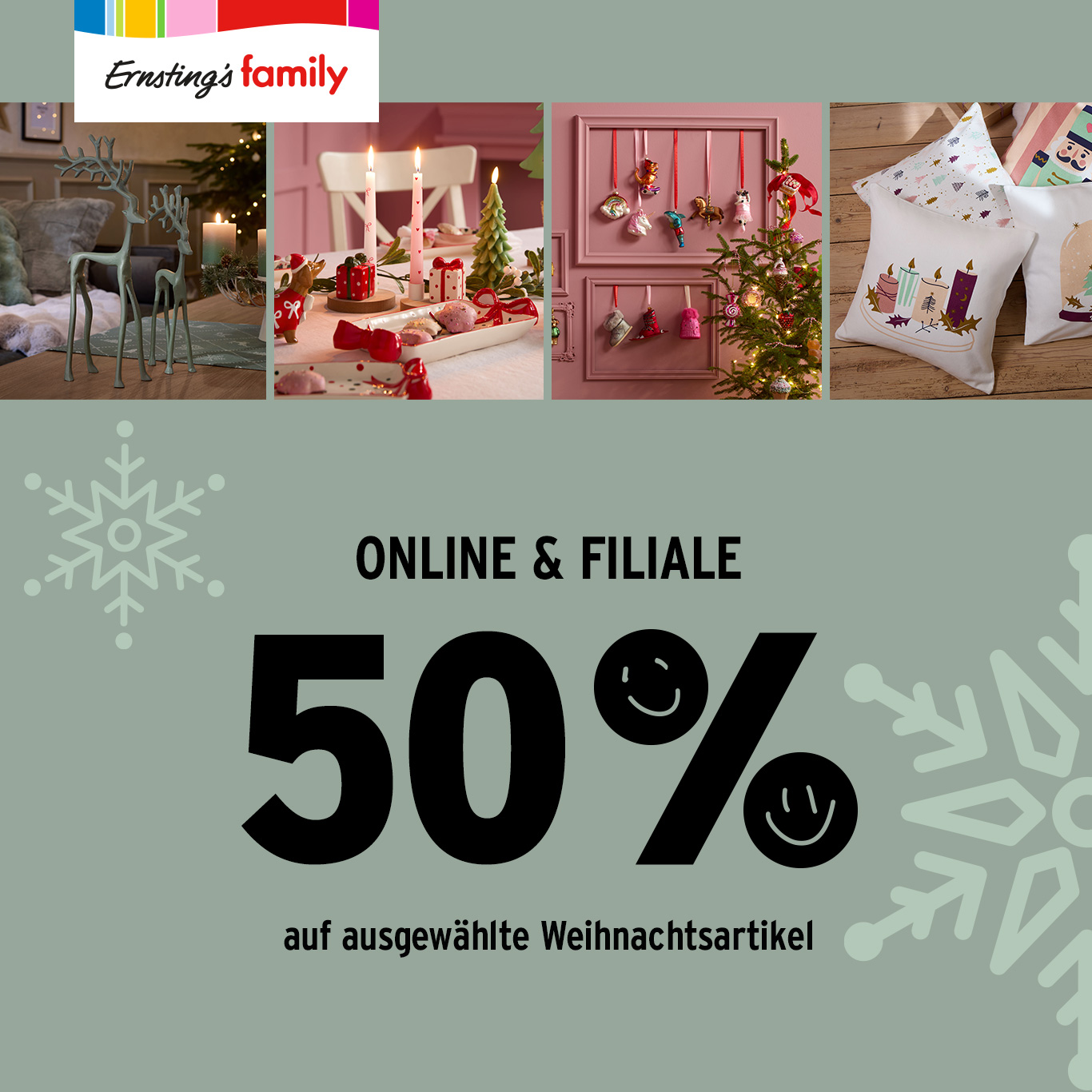 *Der Rabatt gilt vom 08.12. bis 10.12.2025 auf alle weihnachtlichen Artikel. Gültig im Online Shop, in der App und in allen Filialen von Ernsting's family. Der Rabatt gilt nicht auf preisgebundene Bücher, Gutscheine und Versandkosten. Internetpakete können nicht nachträglich bei Abholung in der Filiale rabattiert werden. Nicht kombinierbar mit anderen (Aktions-)Rabatten.Der Rabatt wird automatisch am Ende des Bezahlvorgangs abgezogen.